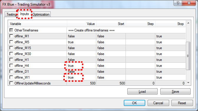 The list of settings includes options such as offline_M1 and offline_D1. You simply turn on the extra timeframes which you want. Please note that each extra timeframe will slightly reduce the Simulator's speed.