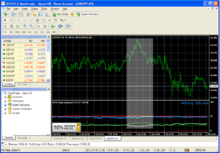 It displays the same data as the website at http://www.fxblue.com/connect/#sentiment but does so within the MT5 software as a custom indicator, allowing the trader sentiment to be compared against price action.
