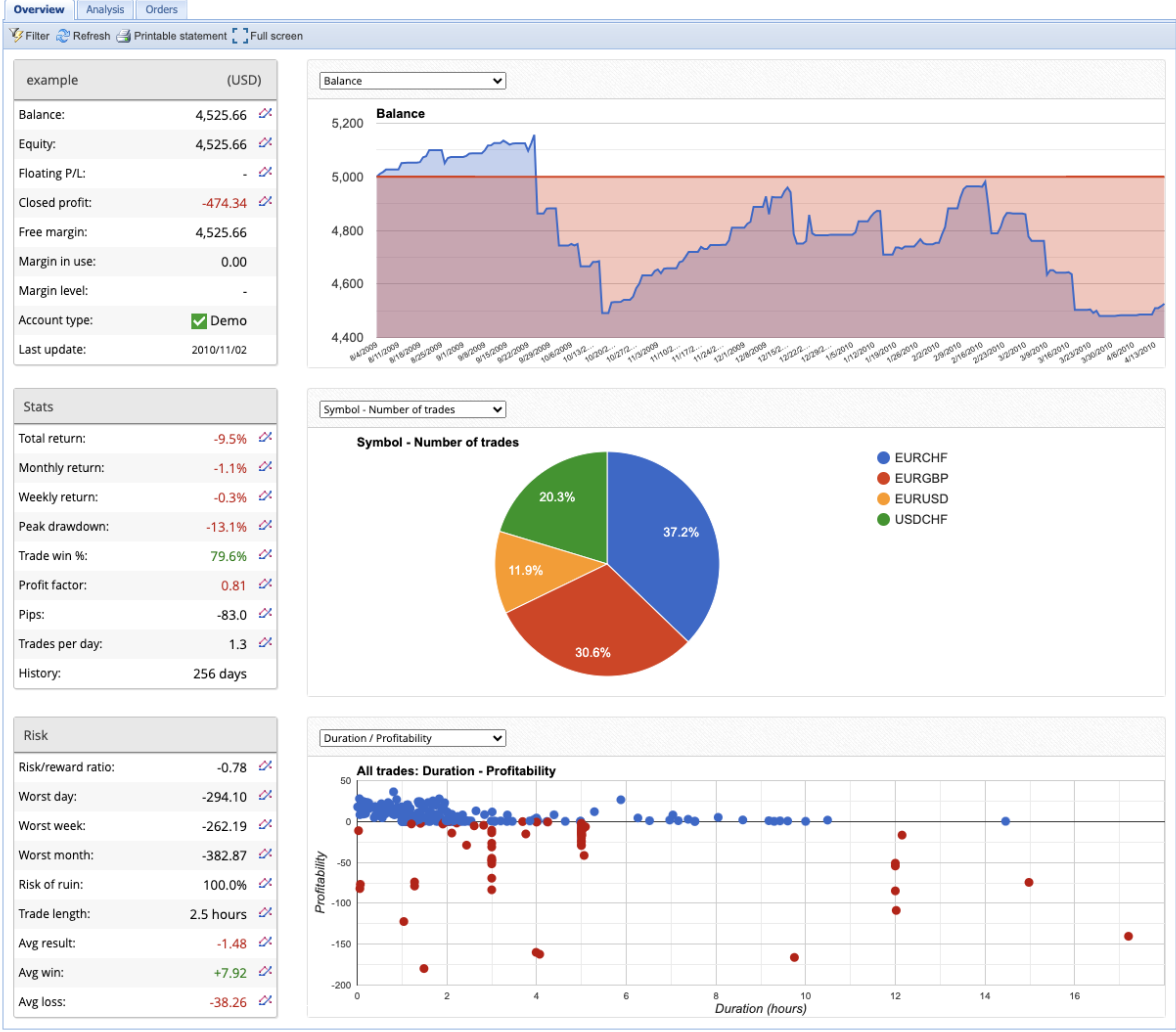 FX Blue Live is a free web-based service for analyzing and publishing your trading history. Publication is almost instant after trading activity, with updates as frequently as every 60 seconds while trades are active.