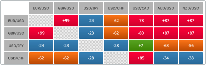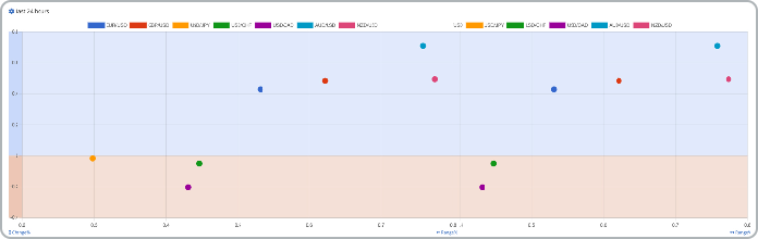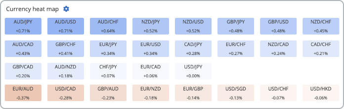 The currency heat map shows the largest rises/falls in cur. pairs over the last 24h, identifying where trading has been most active.