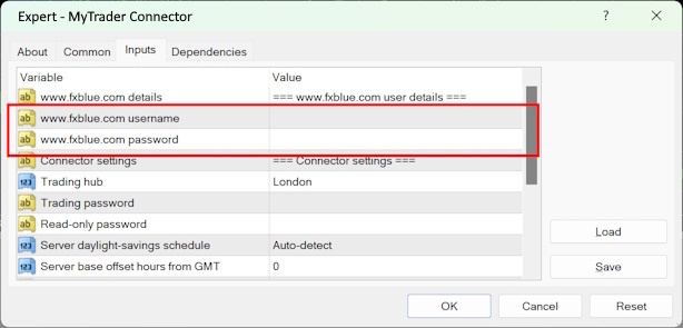 On the Inputs tab of the settings window, you need to enter your username and password for www.fxblue.com.