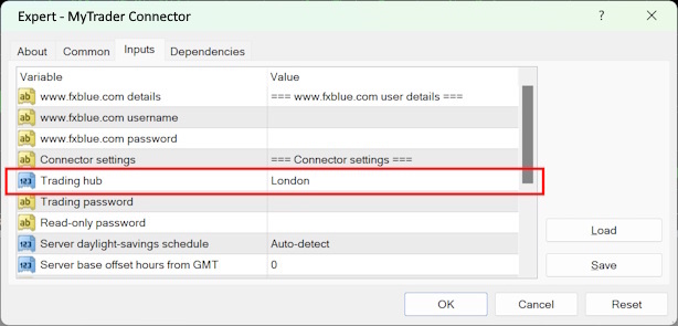 On the Inputs tab of the settings window, you need to choose which MyTrader hub to connect to. You simply pick the hub nearest to you. You need to make the same choice when logging into the MyTrader web/mobile platform.