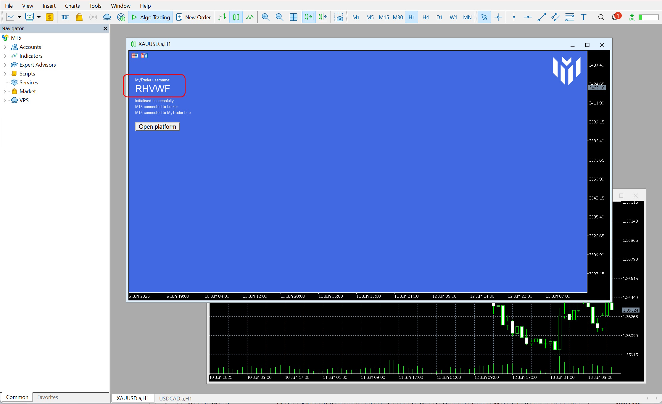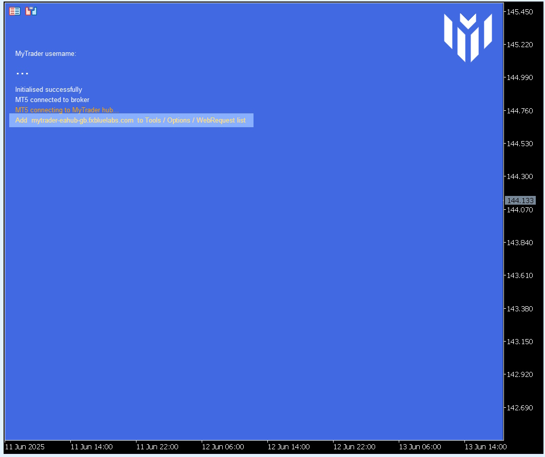 When you save the settings and start the EA, the chart will turn blue and the EA will display status information about its connection. It will also display, in large capital letters, a username such as RHVWF. You log in to the MyTrader web/mobile platform using this username, plus the password which you chose in the Settings window (above).