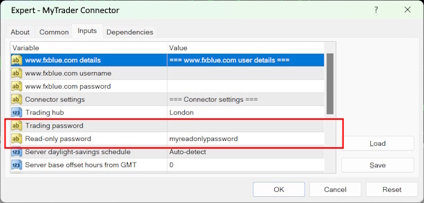 On live accounts, you must only set a read-only password. The EA will reject your settings if you try to set a trading password. To trade a live account, please ask your account manager at your MT4/MT5 brokerage to contact sales@fxbluelabs.com
