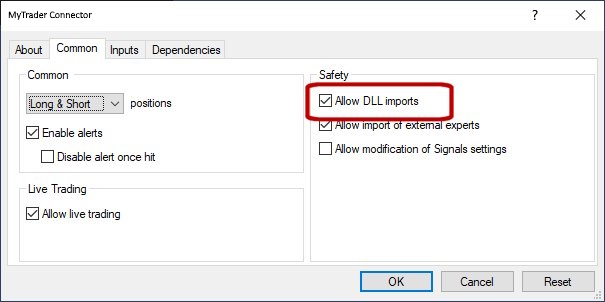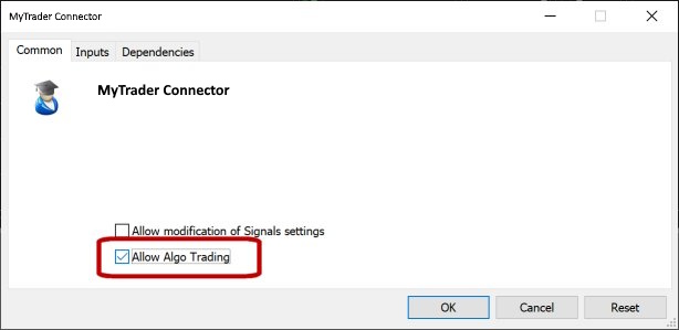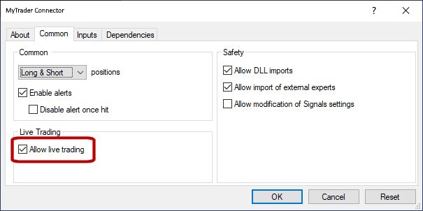 Please note: you can use the MyTrader Connector EA with both demo and live accounts, but you cannot trade on live accounts.