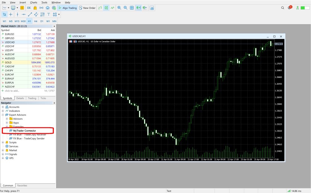 You open a new chart in MT4/MT5, for any symbol and timeframe, and run the EA on it by double-clicking on "MyTrader Connector" in the MT4/MT5 Navigator, or by dragging the EA from the Navigator onto the chart. (For MT4 only: ignore the MyTrader-Worker EA in the Navigator. This is explained below, and is used automatically by the main MyTrader EA.)