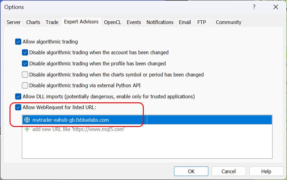 When you add the EA to a chart, it will display the setting which you need to add to the WebRequest list: